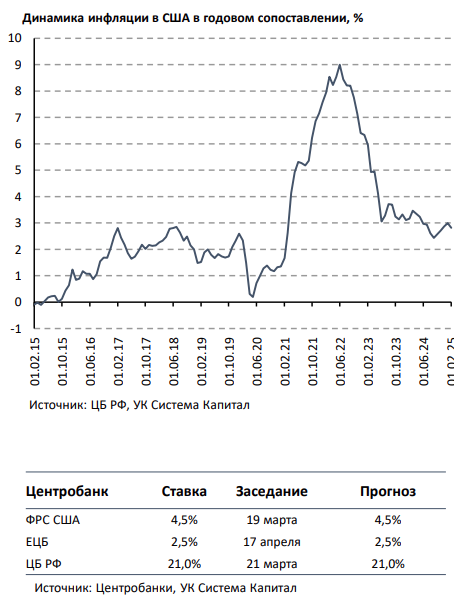 - Ставки UST стабилизировались на уровнях 4,1-4,3%. Риск эскалации торговых войн и вероятного замедления экономики уже отражается в снижении потребительского доверия в США. Инфляция в феврале замедлилась с 0,5% до 0,2% м/м и с 3% до 2,8% г/г.