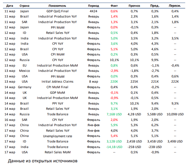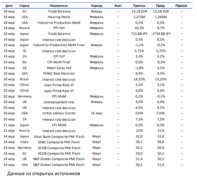 Текущая неделя по объёму макроэкономической статистики будет насыщенной. В первую очередь выделяем количество заседаний ЦБ: среди развитых стран решения по ставкам будут приниматься в США, Японии и Великобритании, а среди развивающихся – в Китае, России, Бразилии, Индонезии и ЮАР. В настоящий момент рынок ожидает сохранения ставок почти по всем странам, кроме Бразилии, где консенсус предполагает повышение «ключа» для борьбы с растущей инфляцией. Говоря про статистику, отмечаем выход данных по закладке новых домов, рынку труда и уровню промышленного производства в США, а также по инфляции в ЕС, Германии и Японии. В развивающихся странах внимания достойна статистика по инфляции в России и ЮАР. Более того, стоит сказать о публикации предварительных оценок композитного индикатора PMI за март во многих странах.
