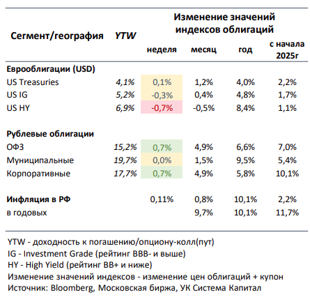Недельная инфляция в РФ несколько замедлилась с 0,15% до 0,11%, годовая остается чуть выше 10%. Инфляция за февраль снизилась с 1,23% до 0,81%, что соответствует около 8% с учетом корректировки на сезонность в годовом выражении. Наблюдаемое замедление данного показателя инфляции с 14% и 11% в декабре и январе соответственно вместе с некоторым снижением инфляционных ожиданий указывает на вероятную достаточность ужесточения ДКП и возможность смягчения тональности регулятора. При этом отметим, что на прошлой неделе зампред ЦБ заявил о том, что пока недостаточно оснований говорить о тренде и устойчивом снижении инфляции. Также он подтвердил, что ЦБ будет оценивать целесообразность повышения ключевой ставки на ближайшем заседании в пятницу, поскольку поступившие за месяц данные значимо не изменили картину по инфляции и экономике. На наш взгляд, ЦБ сохранит ключевую ставку на уровне 21%, но, возможно, несколько смягчит сигнал с умеренно-жесткого на нейтральный на фоне замедления инфляции, умеренного снижения экономической активности, а также некоторого улучшения на рынке труда. Отметим, что во многом будущая динамика на облигационном рынке будет определяться ситуацией на переговорном треке между РФ и США.